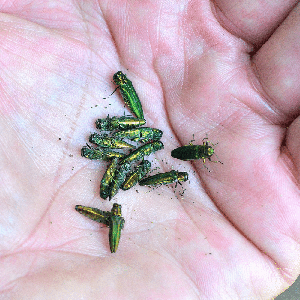 These harmful beetles are emerald green and about ½ inch long as an adult. The larva is a white, worm-looking insect that lives inside the tree. You typically will not see them as they live underneath the bark, so keep an eye on your trees for the following symptoms:
